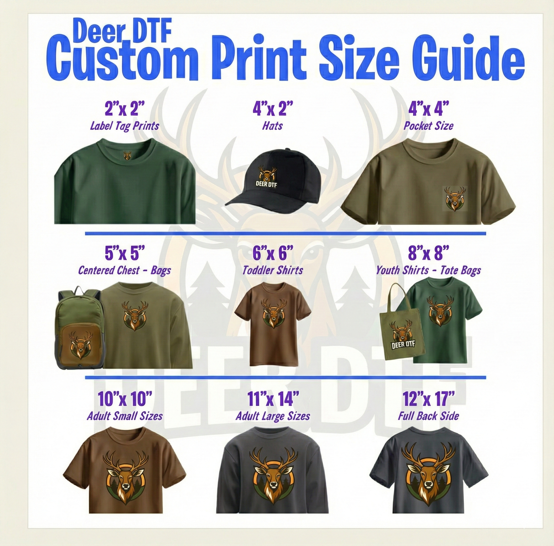 Forget generic sizing. Deer DTF offers transfer sheets built for real-world apparel needs—from small, subtle placements to striking full-front and full-back designs. Each sheet is crafted to complement your artwork and showcase your creativity without compromise.